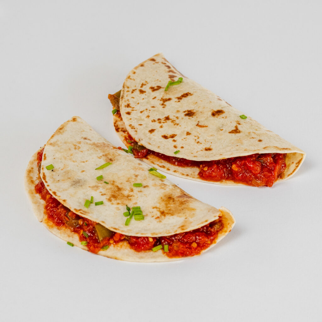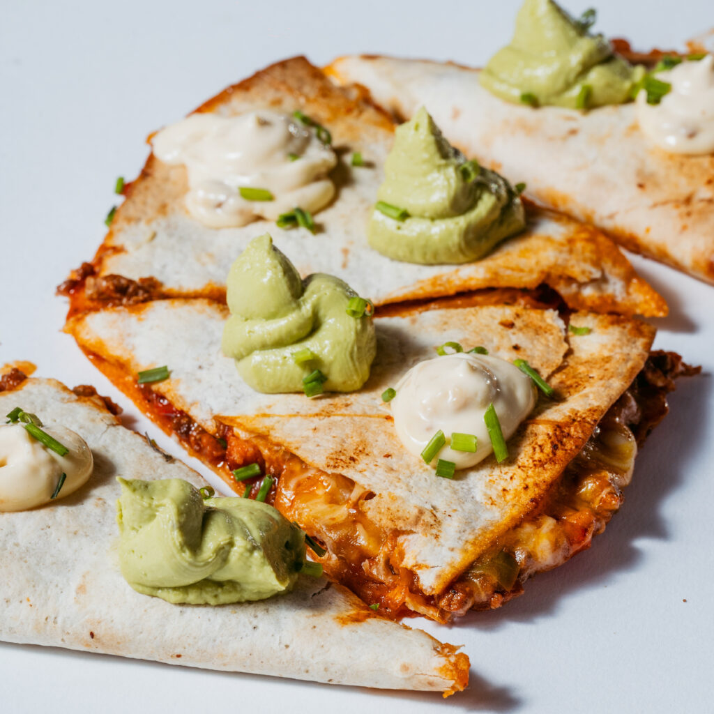 Tortitas de trigo, 4 quesos, carne madurada, tomate frito, guacamole casero, bacon, mayonesa de ajo y lima.
