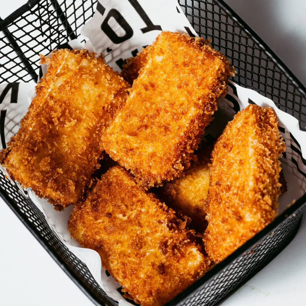 Pan brioche negro, 180 g. de muslo deshuesado de pollo rebozado, queso cheddar, cebolla morada, lechuga, tomate y nuestra salsa.