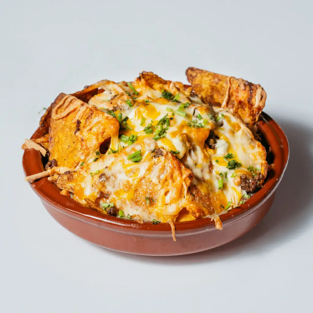 Nachos con carne picada, pimiento verde, pimiento rojo, cebolla, queso fundido y deliciosa salsa XIXA.