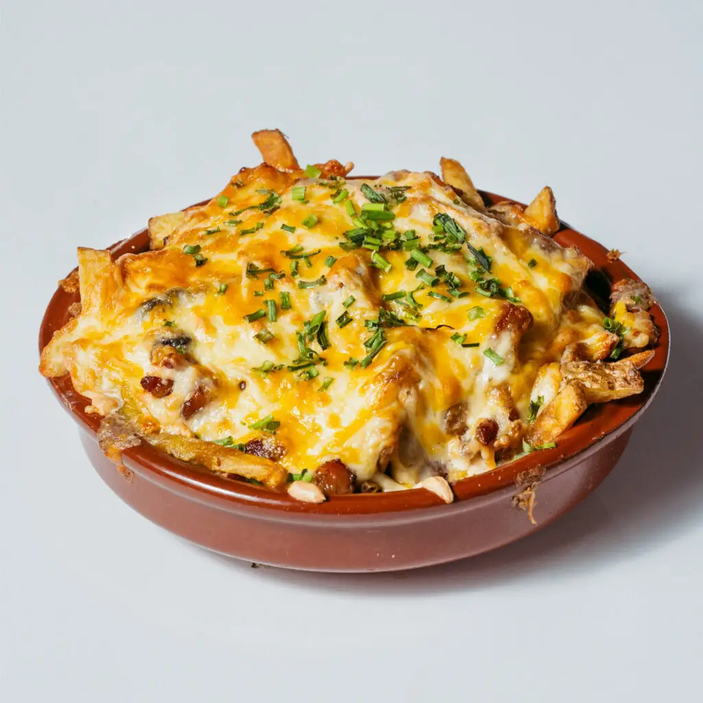 Patatas fritas caseras con bacon, queso fundido y nuestra deliciosa salsa secreta.