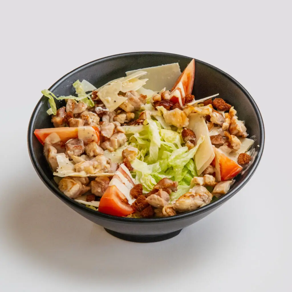 Lechuga, tomate, picatostes, queso padano, pollo y salsa césar.